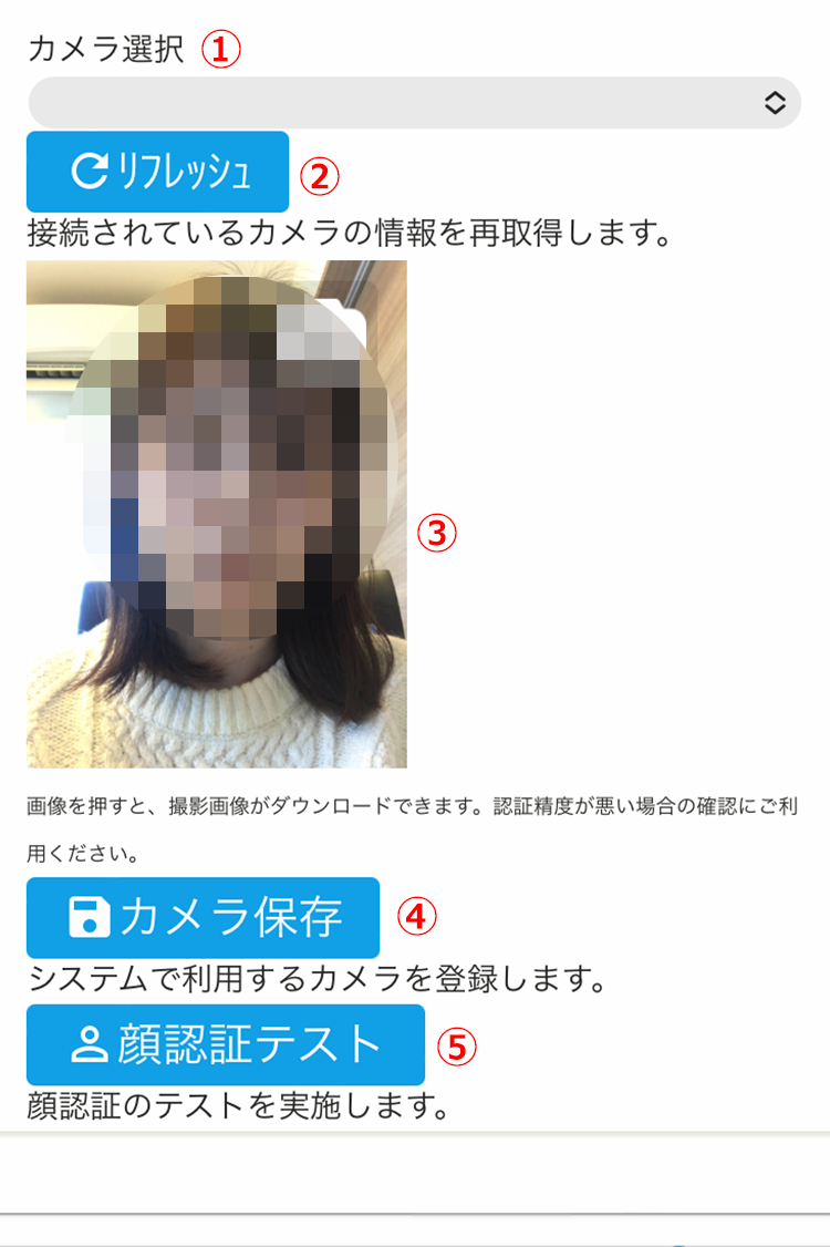 ⑤ 顔認証テスト:顔認証のテストを行ないます。認証に成功すると「認証に成功しました」のダイアログが表示されます。
