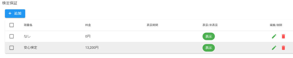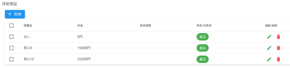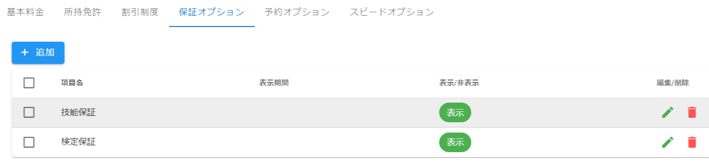 管理画面の「保証オプション」のタブで、まず大項目に「技能保証」と「検定保証」を登録します。