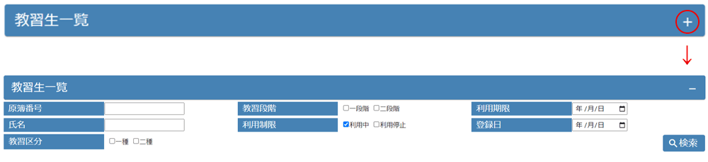 - 検索したい教習生の氏名や、原簿番号などを入力して 検索 することができます
