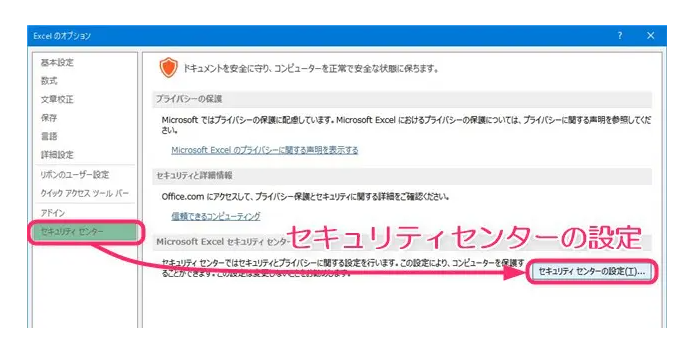 - ※Excelのバージョンにより「トラストセンター」「セキュリティセンター」など表記が違います。(Excel 2013 では「セキュリティセンター」をクリックします。)