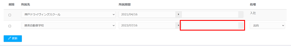 - 「所属期間」の右側のボックスに、出向の終了日を直接入力するか、カレンダーのアイコンをクリックして日付を選択します。