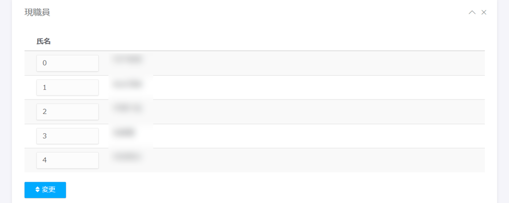 - 変更したい順番の番号を入力し、「変更」ボタンをクリックすると「現職員」一覧の並び順を変更できます。