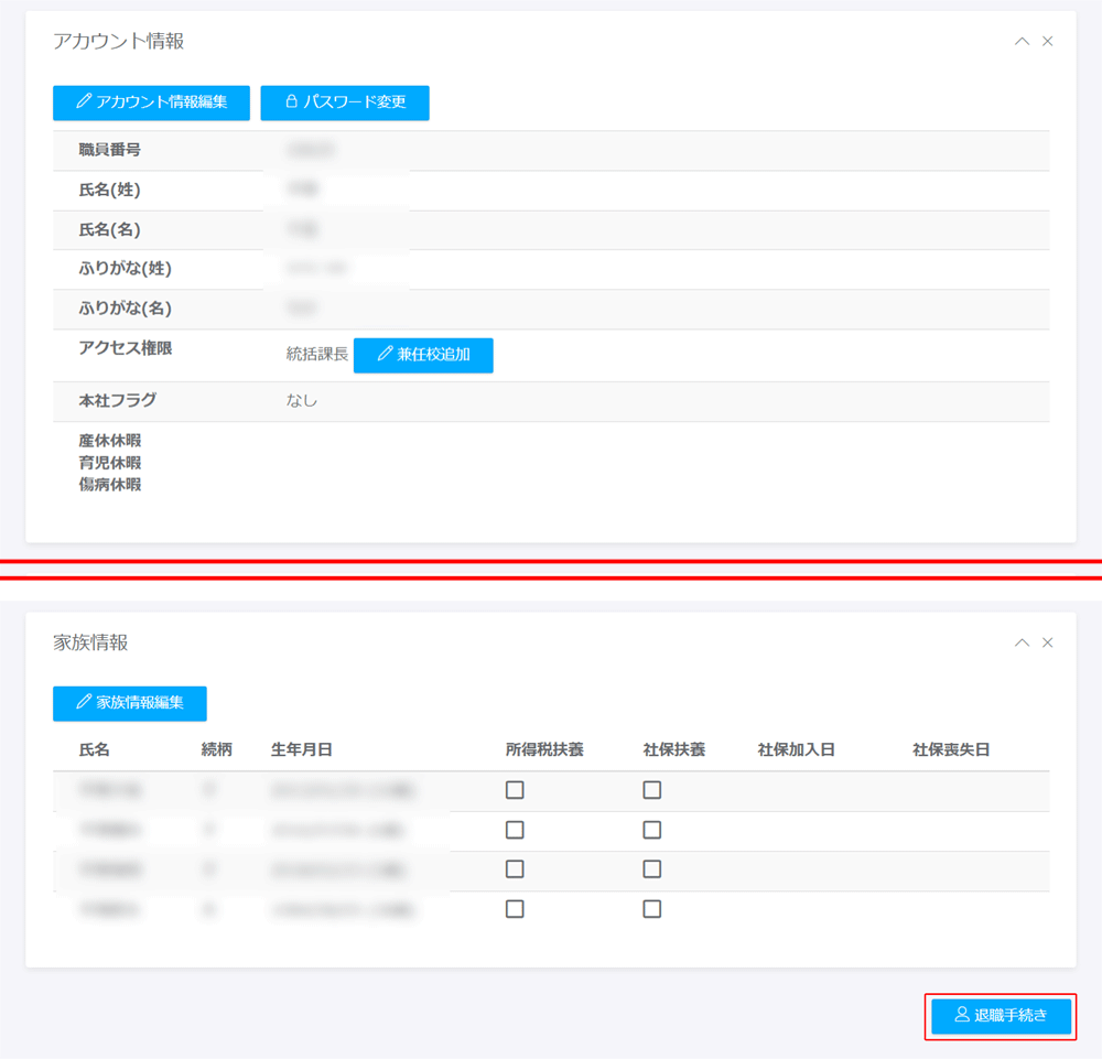 - ページ最下部の「退職手続き」ボタンをクリックします。(「契約情報」の欄にある「退職手続き」ボタンからでもOKです。)