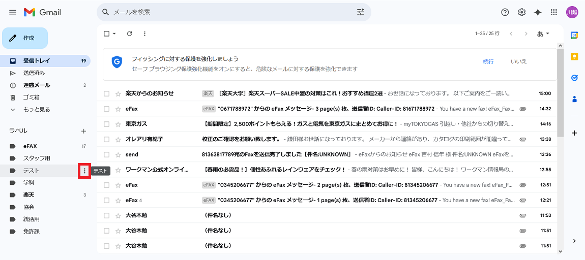 メールが送られた場合はこのようにラベルがついてタグ付けされます。
