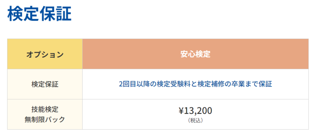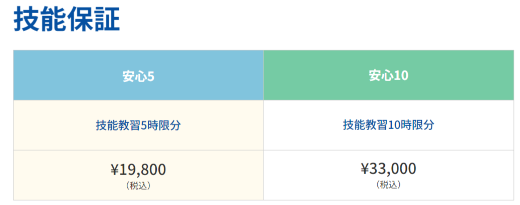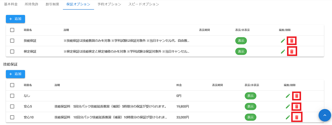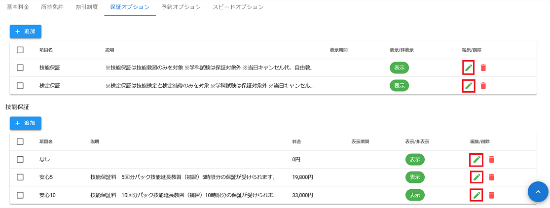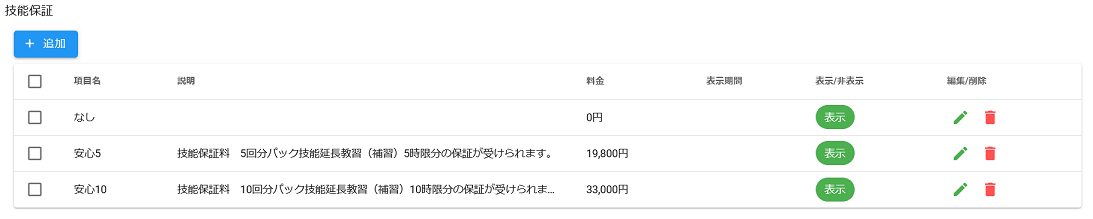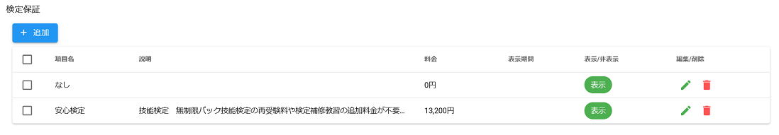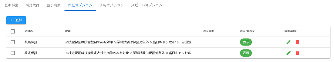 管理画面の「保証オプション」のタブで、まず大項目に「技能保証」と「検定保証」を登録します。