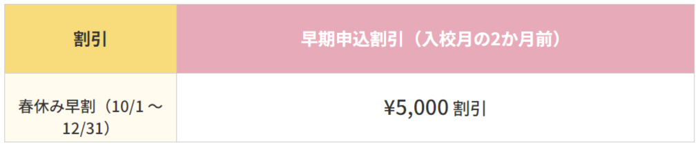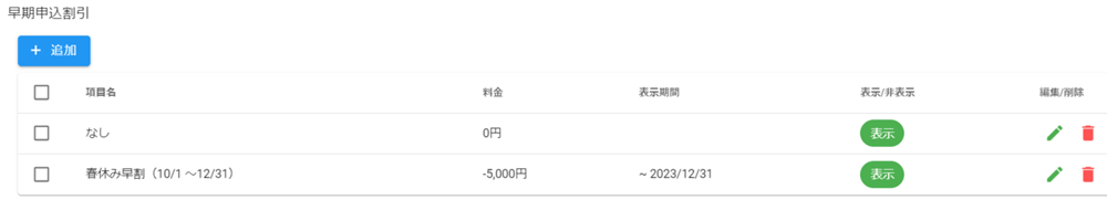 早期申込割引を設定してる場合はこちらの小項目に表示させたい項目を登録します。