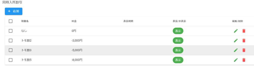 同時入所割引を設定してる場合はこちらの小項目に表示させたい項目を登録します。