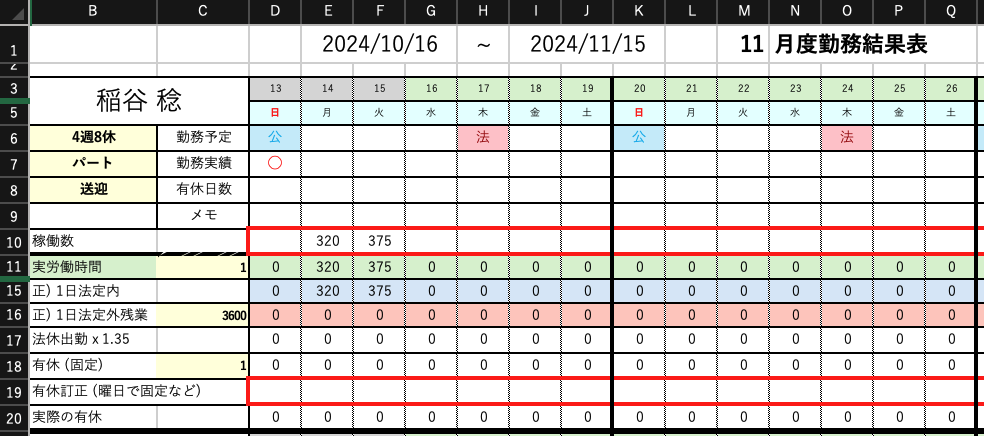 実労働時間(分 単位)は、自動で 11行目 に計算されます。