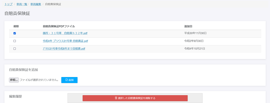 廃棄ボタンをクリックしたら車両一覧から消えて、車両廃棄履歴に表示されます。