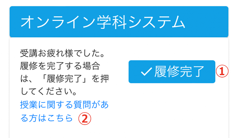 ・授業に関する質問があれば、②をクリック。質問がなければ、①「履修完了」ボタンをクリックし、受講完了となります。