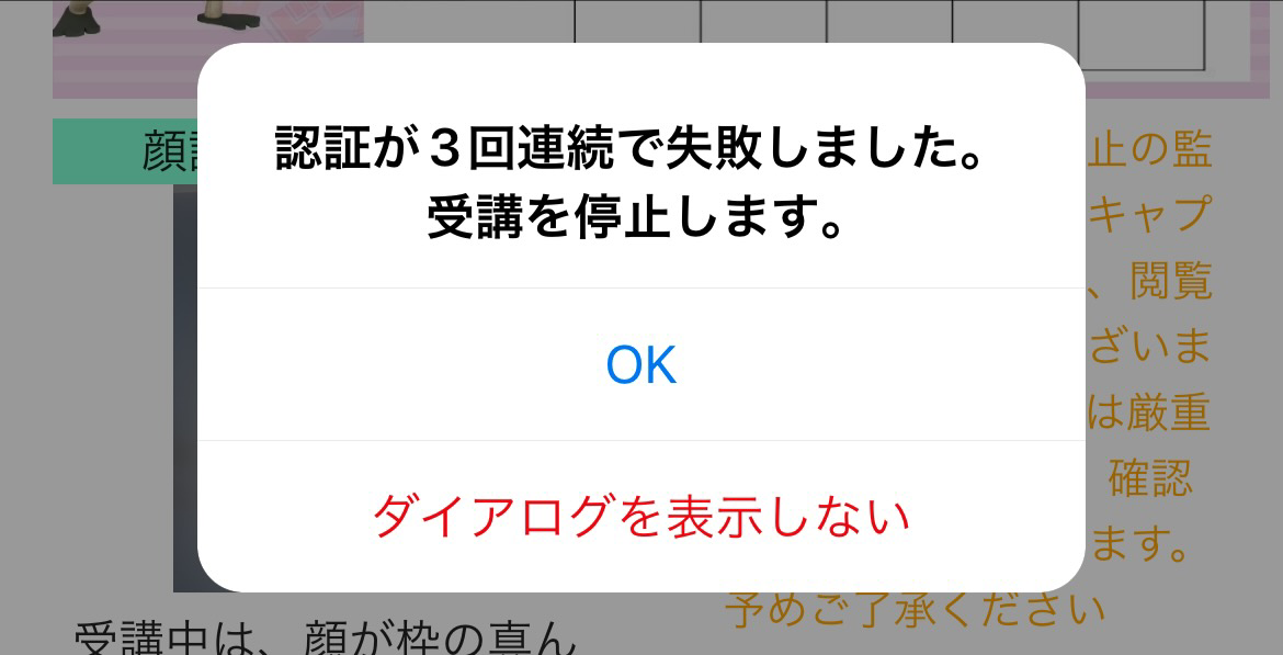 3) 3回連続で認証エラーが発生すると、「認証が3回連続で失敗しました。受講を停止します。」を表示して終了となります。