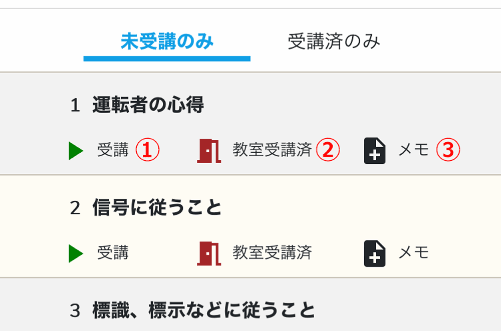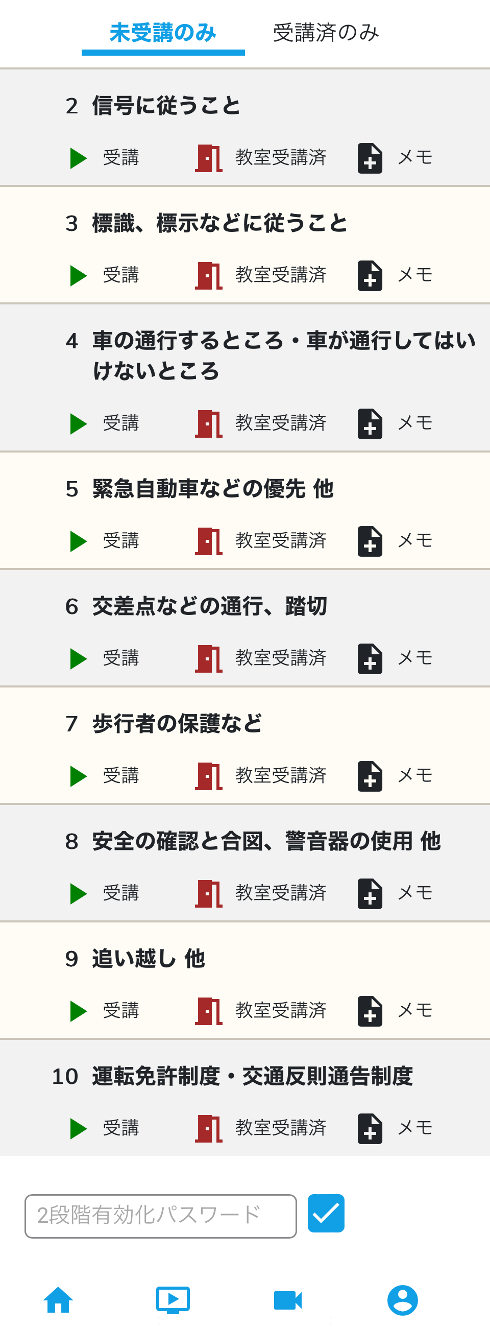 - 「受講済のみ」タブを選択すると、既に視聴を終えた 学科教習 が表示されます。