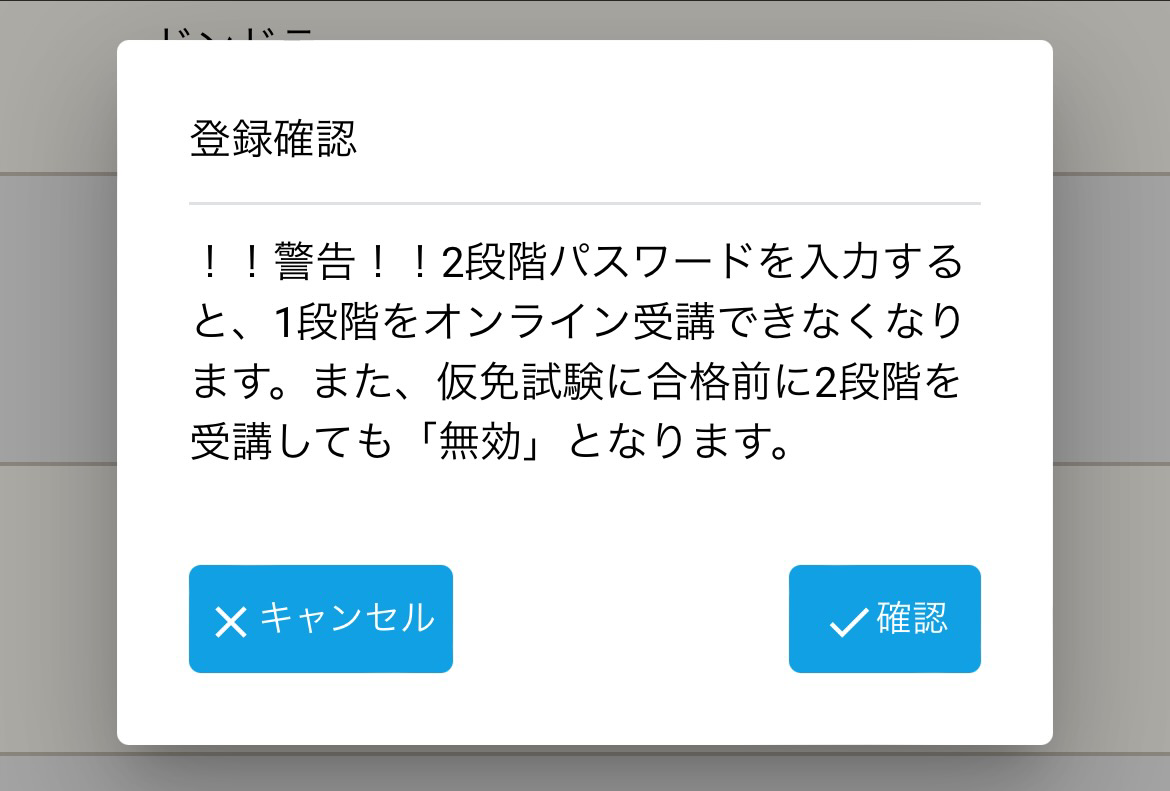 - 一段階に未受講の学科がある状態でパスワードを入力して二段階に進んでしまった場合、「未受講のみ」にも「受講済のみ」にも、受講してない一段階の学科は表示されません。