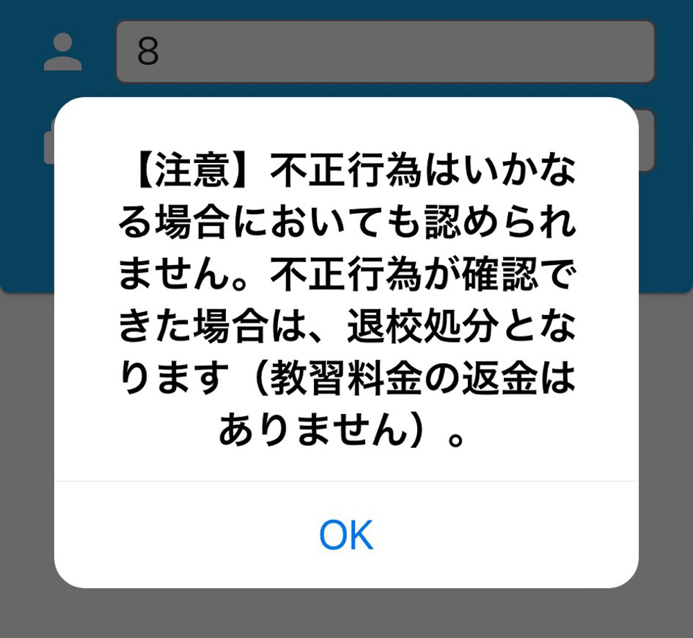 - なりすまし行為による 不正受講が発覚した際は、退校処分という厳しい対応でお願い致します。