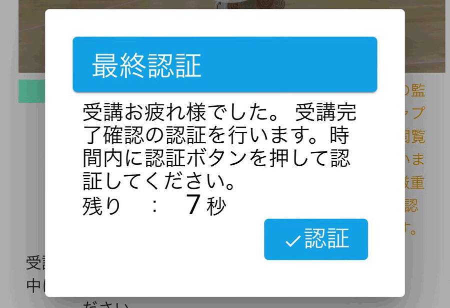 10秒以内に「✓認証」ボタンをクリックしないと受講が完了したことにはなりません。