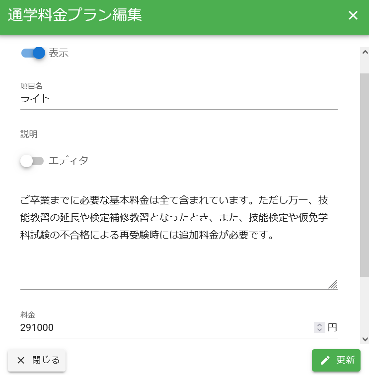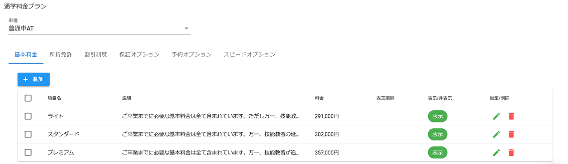 項目名、料金、表示期間、表示or非表示 を設定することができます。