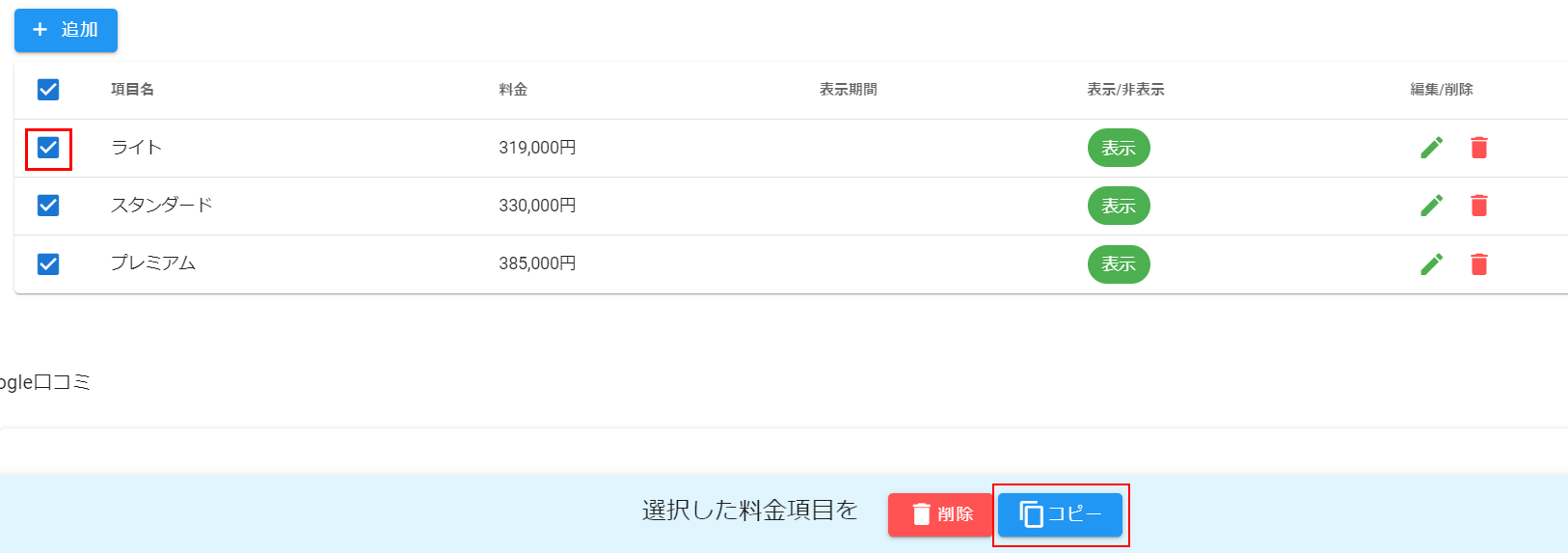 コピーしたい項目の項目名の左のチェックボックスにチェックを入れるとページ最下部に「選択した料金項目を「削除」「コピー」と表示されます。