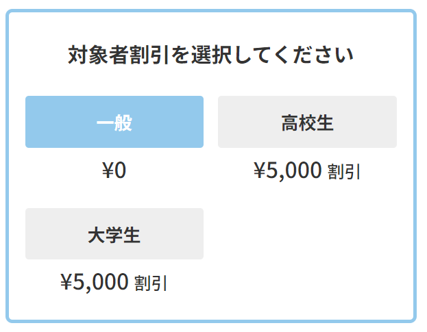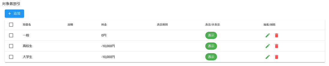 対象者割引を設定してる場合はこちらの小項目に表示させたい項目(対象者)を登録します。