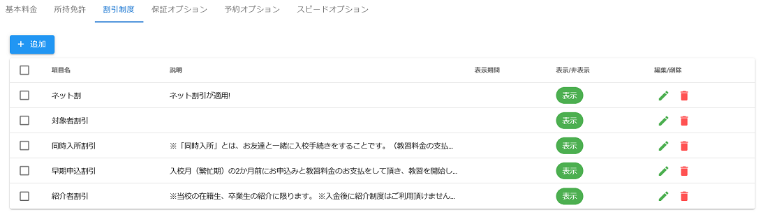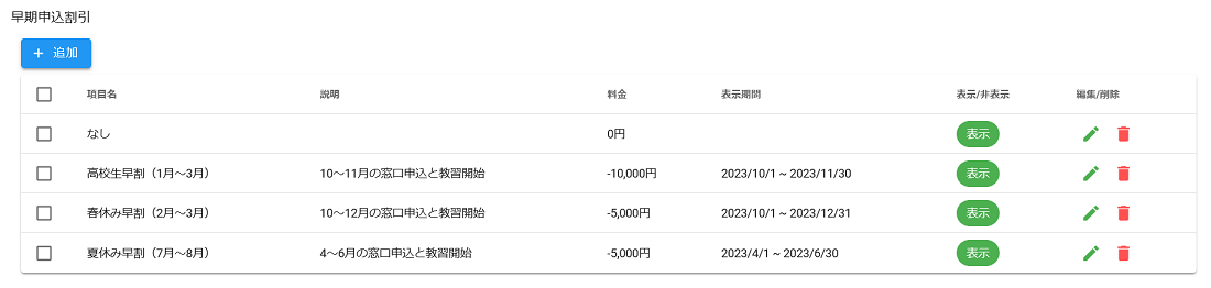 早期申込割引を設定してる場合はこちらの小項目に表示させたい項目を登録します。