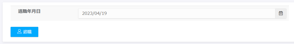 - 退職年月日を入力(直接入力するか、カレンダーのアイコンをクリックして日付を選択)し、「退職」ボタンをクリックで退職処理が完了です。