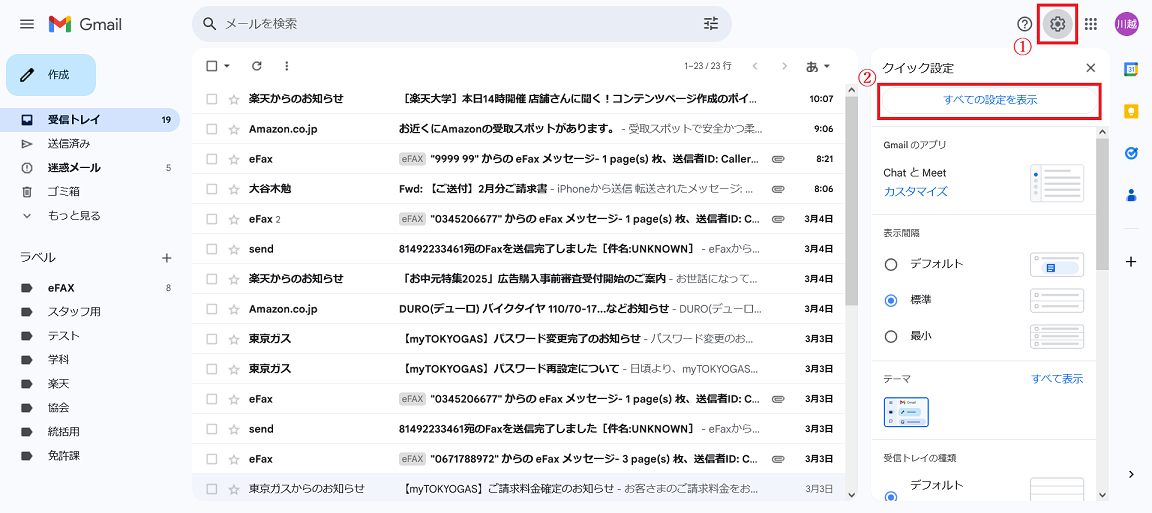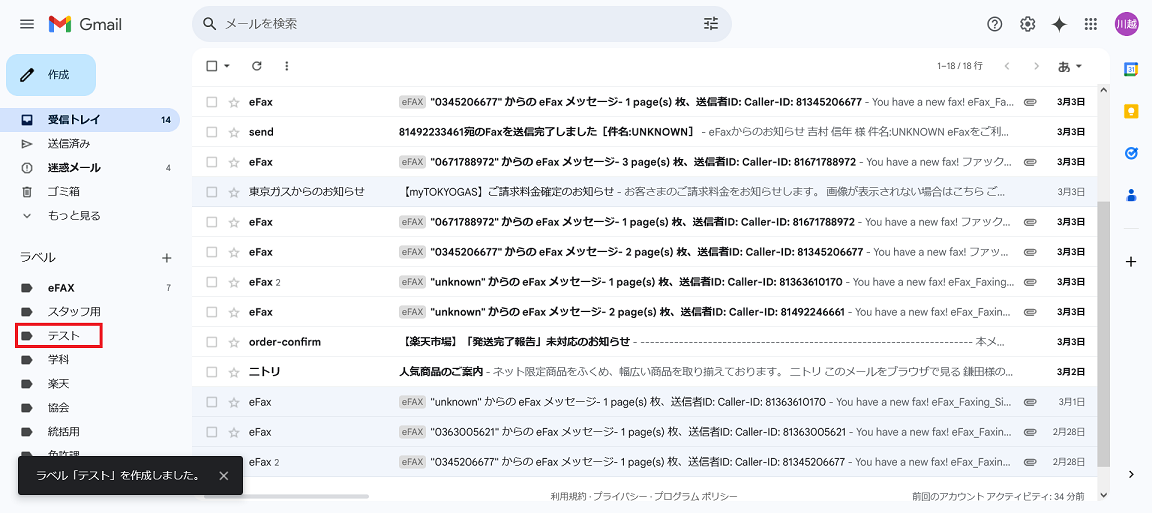 メールが送られた場合はこのようにラベルがついて振り分けされます。