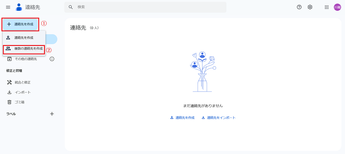 2.「複数の連絡先を作成」をクリックします。(※メールアドレスだけで登録できるためです。)