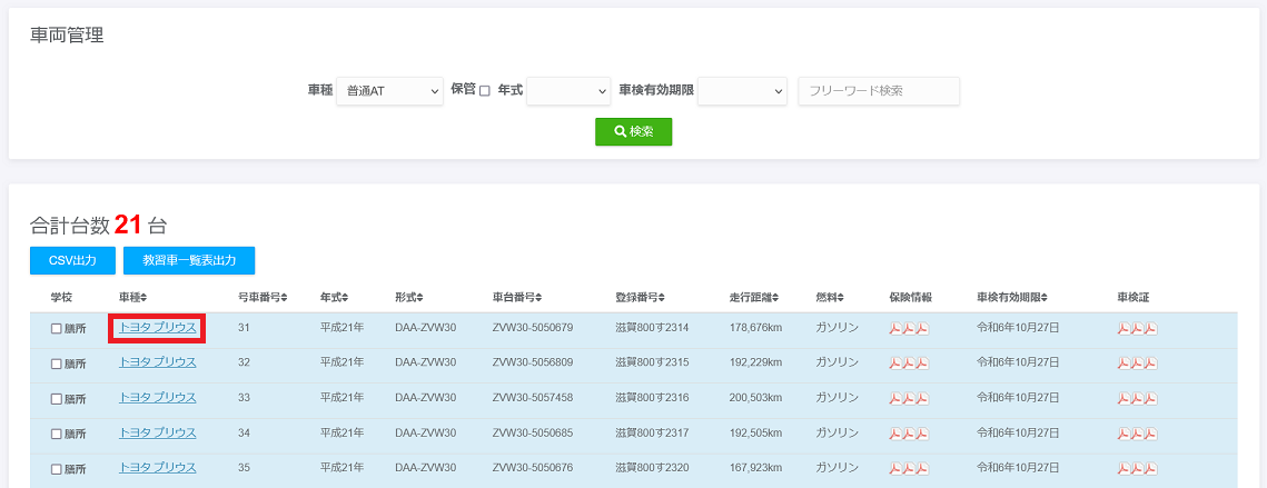 車種名にリンクがついていますのでクリックすると車両編集画面に飛びます。