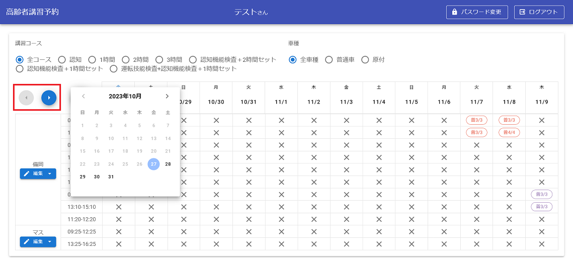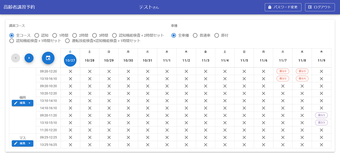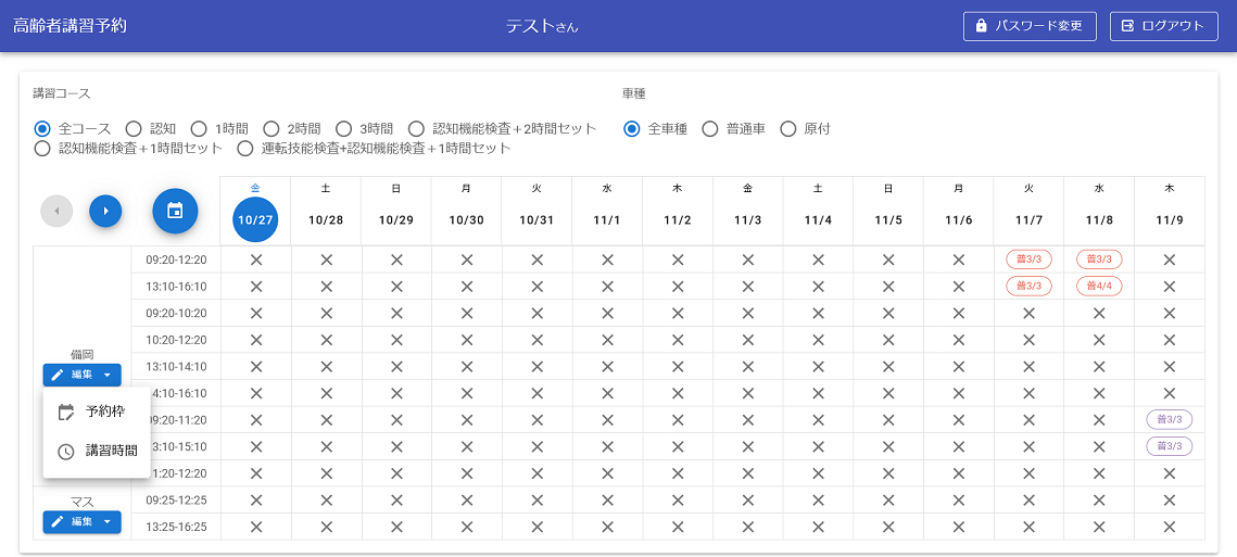 編集ボタンをクリックすると、予約枠と講習時間の選択肢が表示されます。クリックすれば編集画面に飛びます。