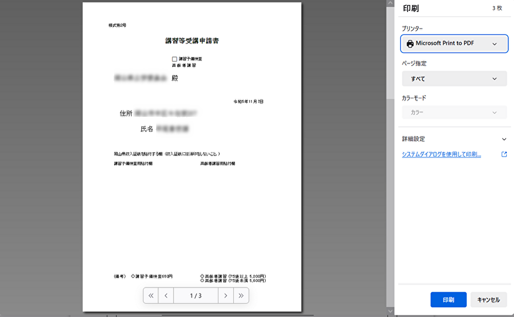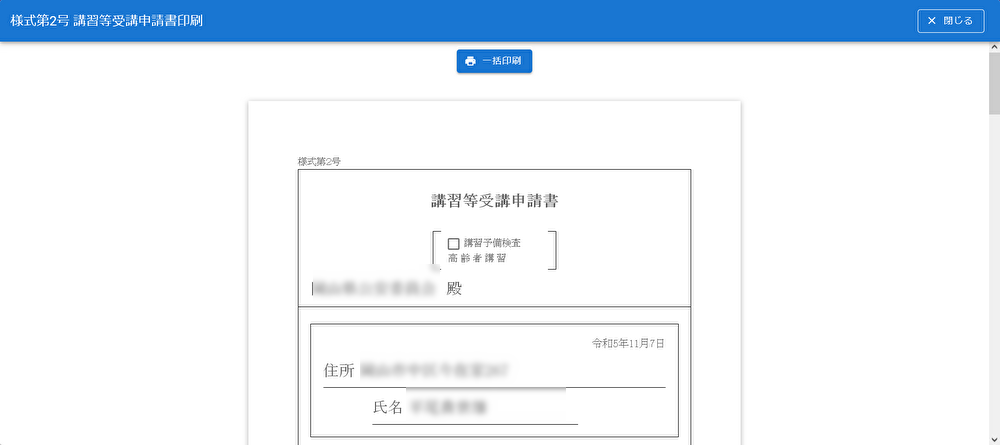 「様式第2号 講習等受講申請書印刷」ボタンをクリックするとプレビュー画面に飛びます。