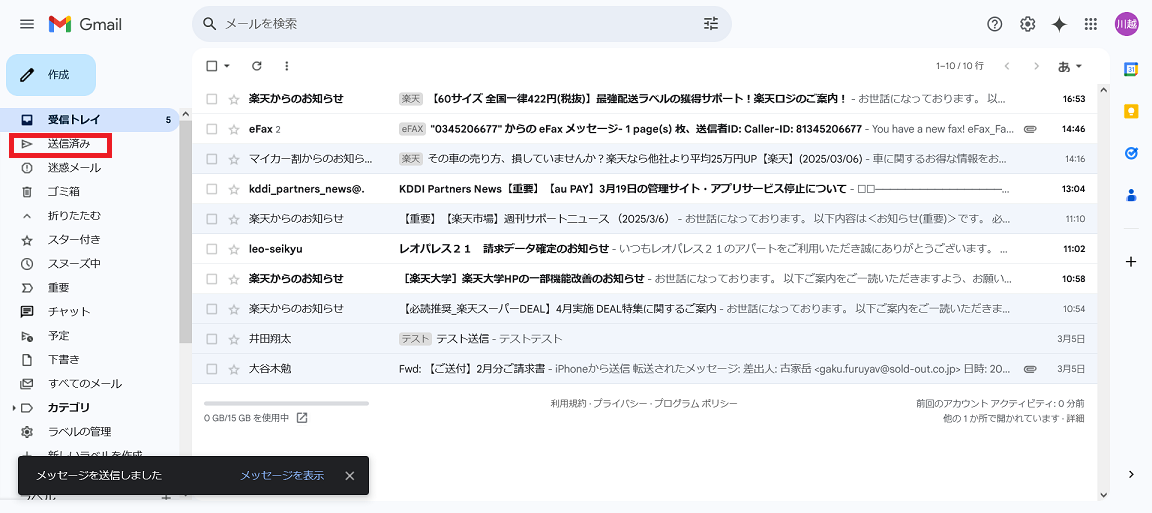 左のメニューの「送信済み」をクリックすれば確認することができます。