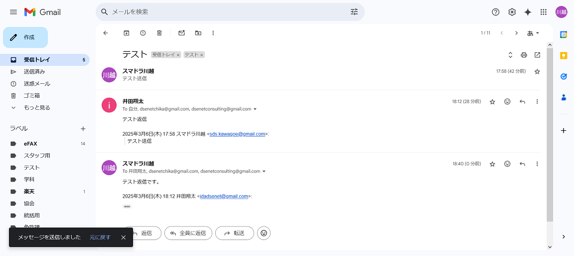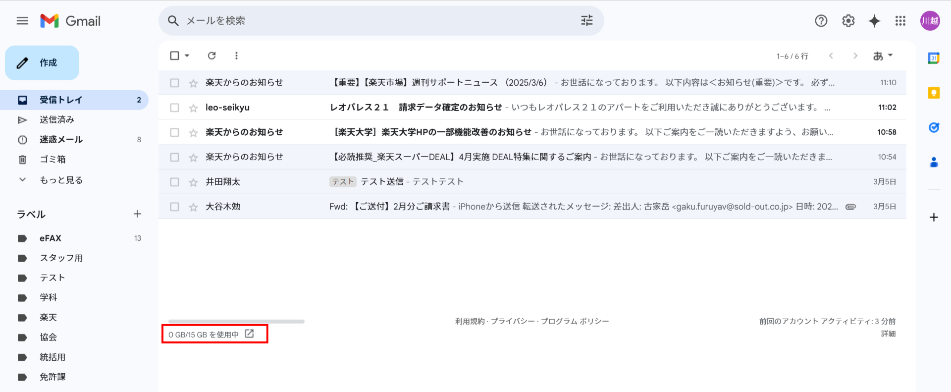 メールが送られた場合はこのようにラベルがついて振り分けされます。