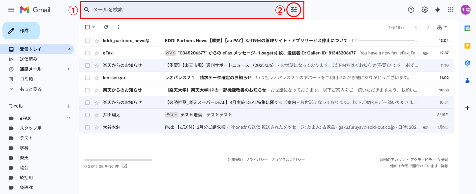 ※システムラベル「ゴミ箱」「迷惑メール」内のメールは検索の対象外です。